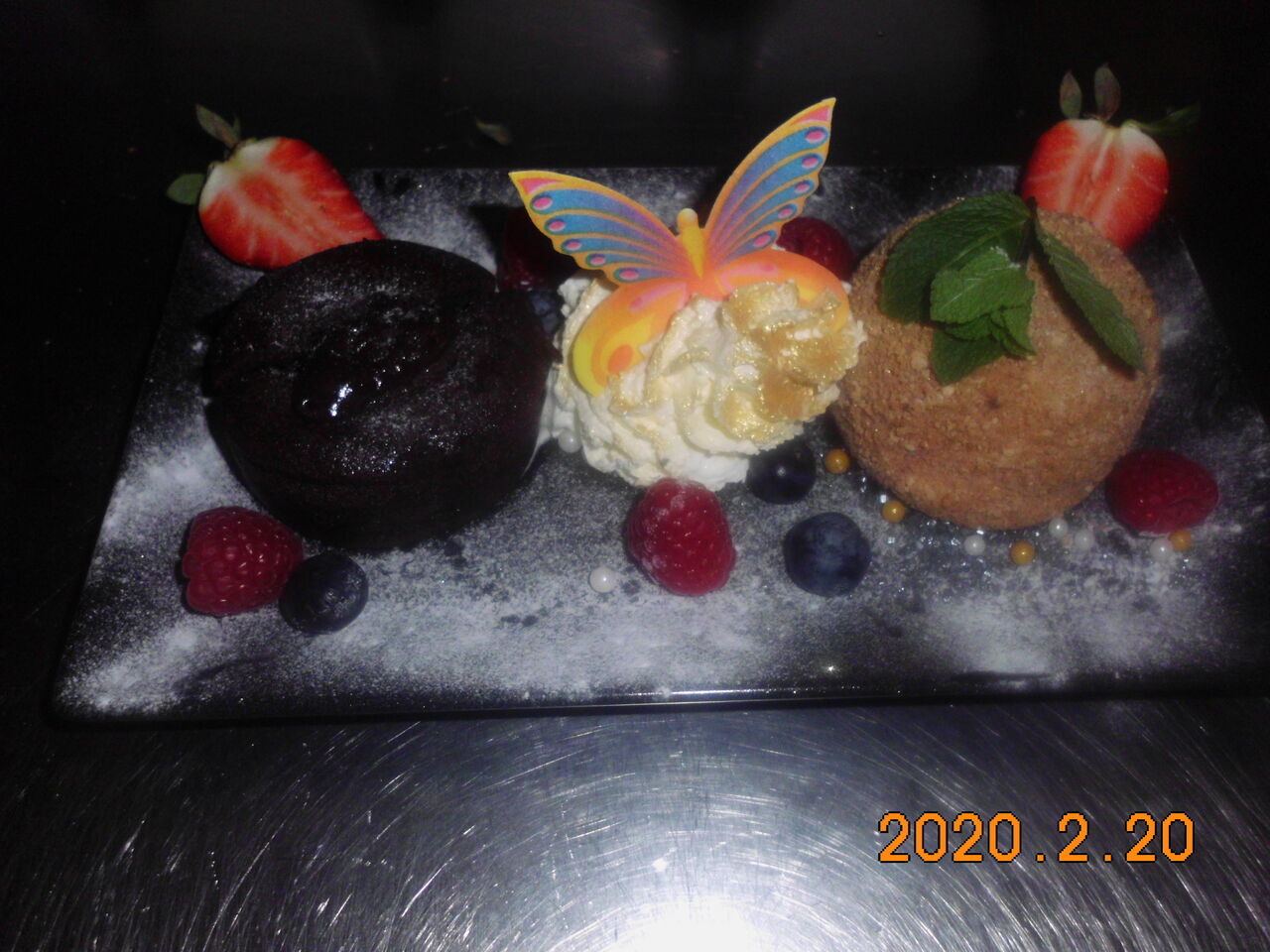 "Hausdessert" Lauwarmer Schokokuchen mit flüssigem Kern, Eisknödel "Marille" und Beeren.