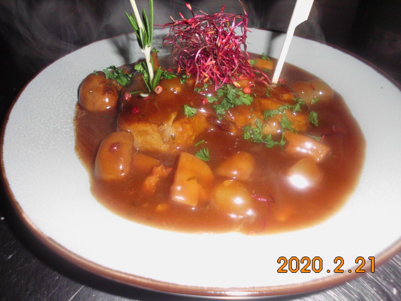 Düsseldorfer "Boeuf Bourguignon" vom argentinischen Rumpsteak, mit Perlzwiebel,Champignons und Speck.